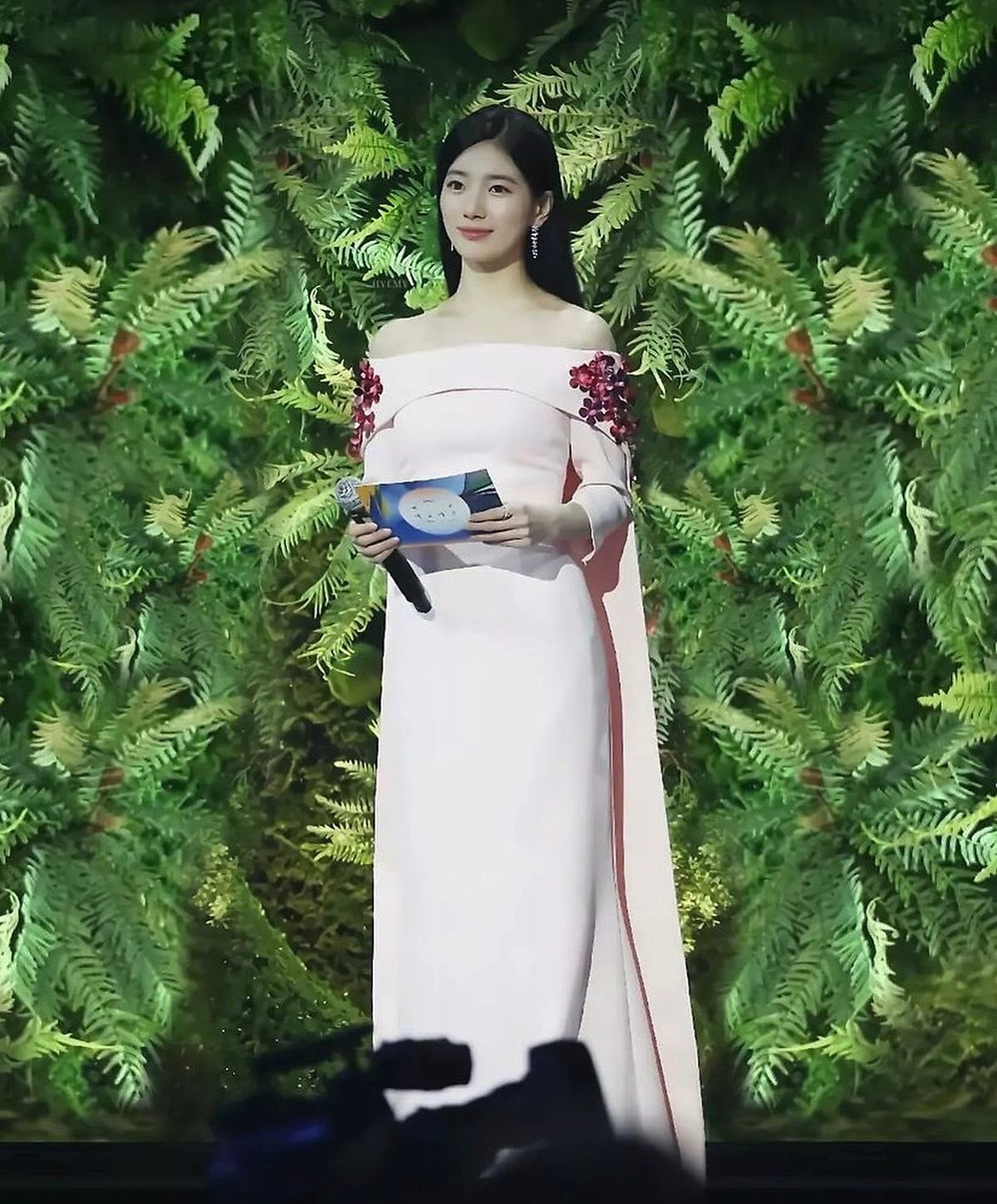 꽃잎같기도하고 하트 모양도 생각나는 라인의 드레스가 어깨를 시원하게 보이며 수지씨에게 잘 어울렸던 것 같습니다.