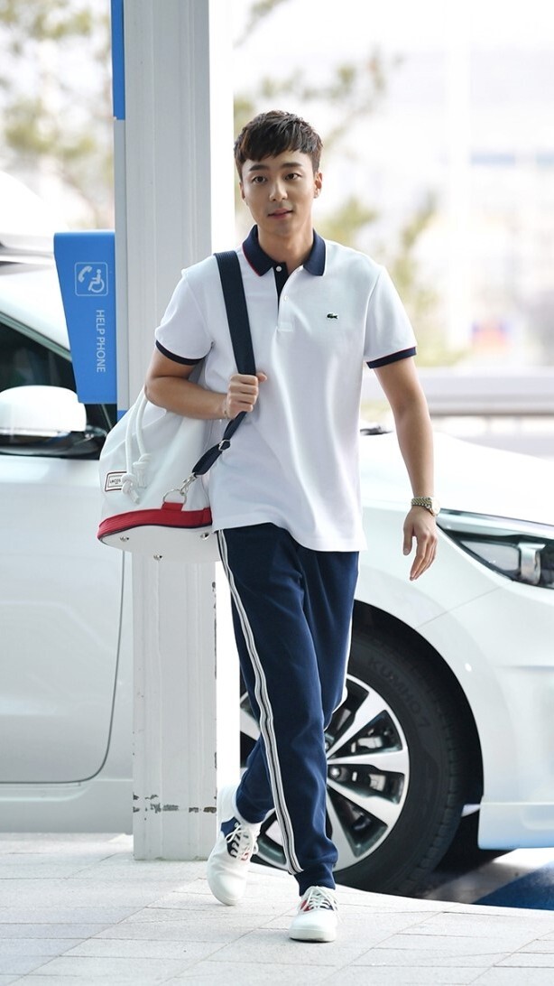 깔끔한 화이트 라코스테 카라티에 네이비 슬랙스로 연출해주었네요.