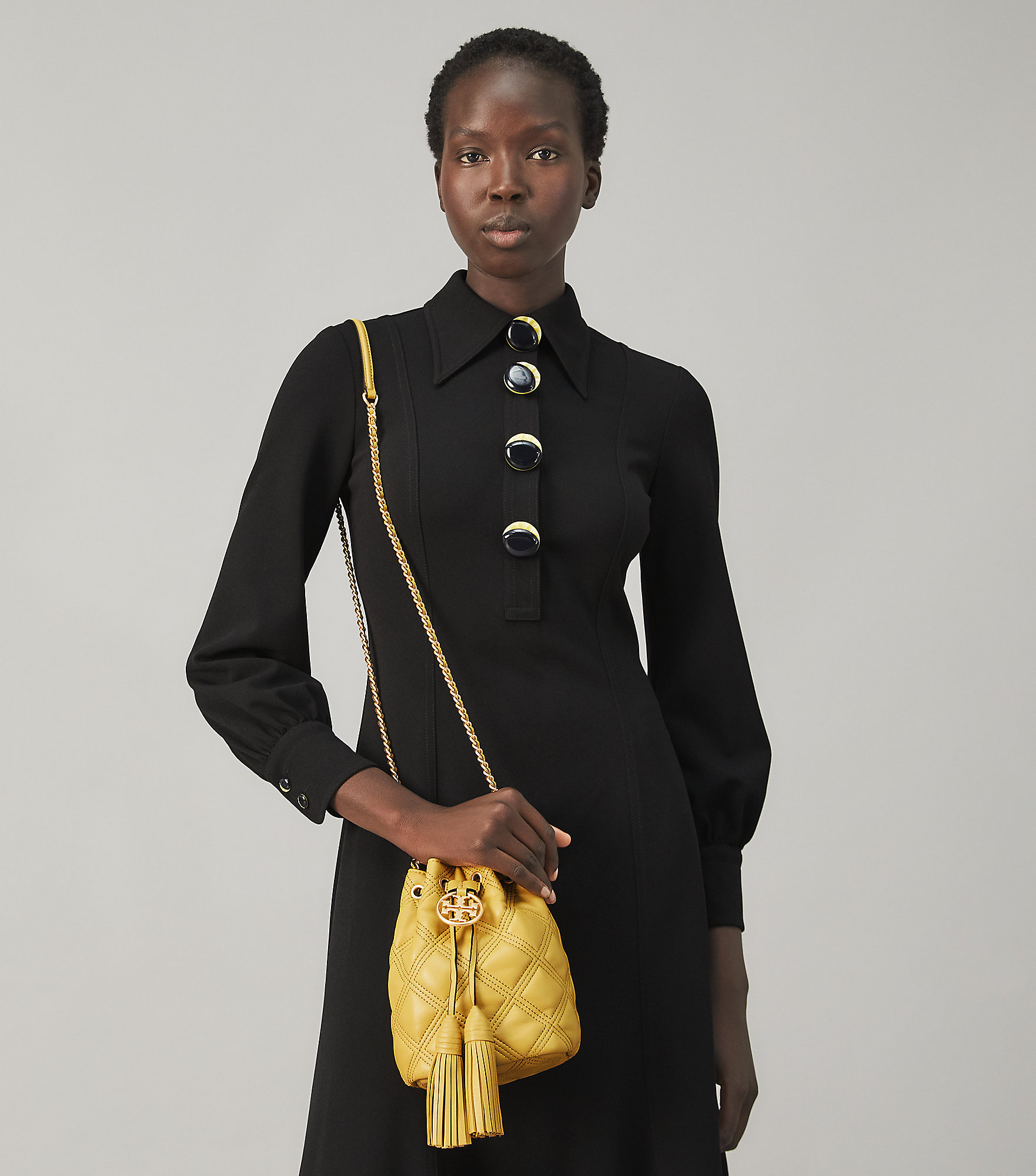 옐로우 컬러의 미니미한 사이즈가 귀여운 스타일의 버킷백이네요.
