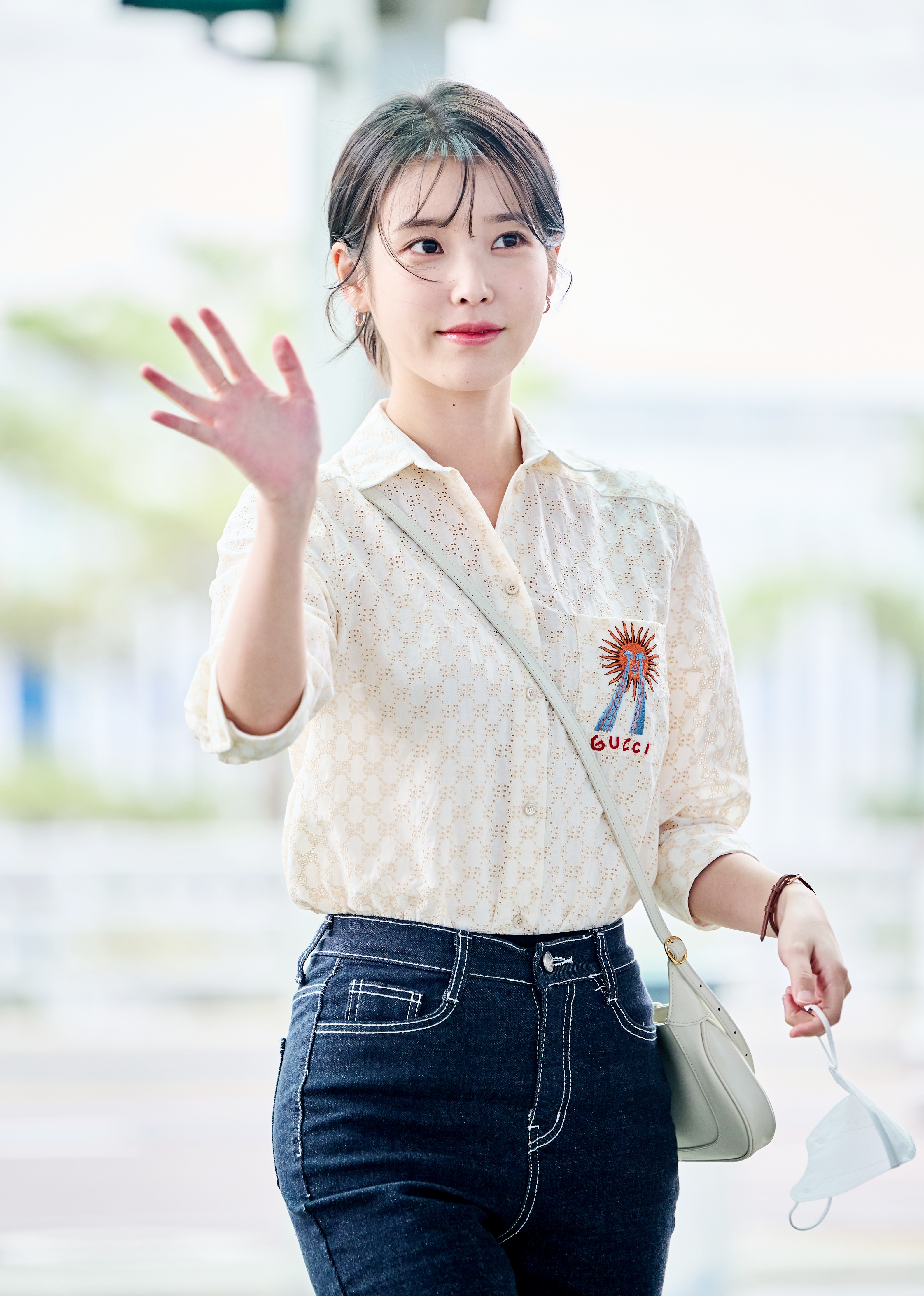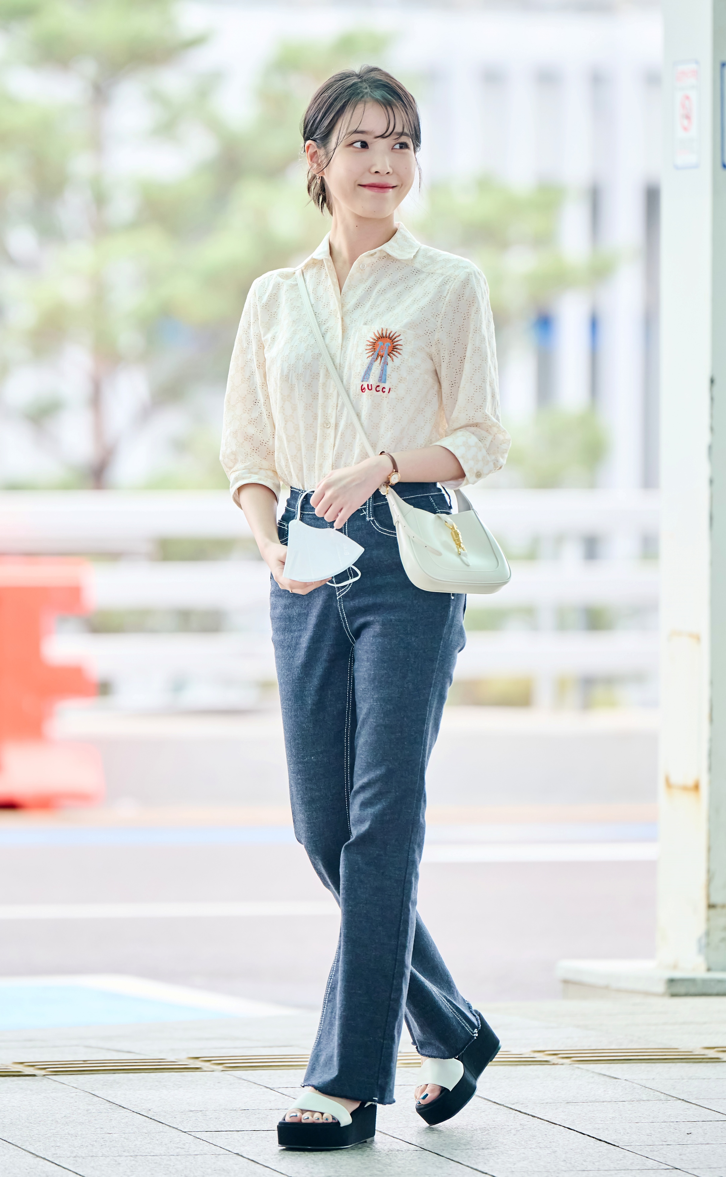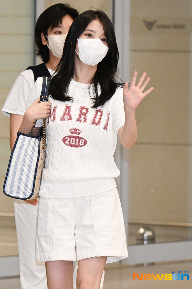 화이트 니트는 밝은 피부의 아이유를 더 환하게 만들어주는 컬러 같네요.