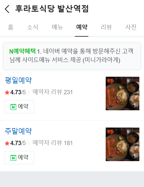 네이버로 예약을 하고 방문하면 사이드메뉴 서비스를 제공한다고 되어있네요.