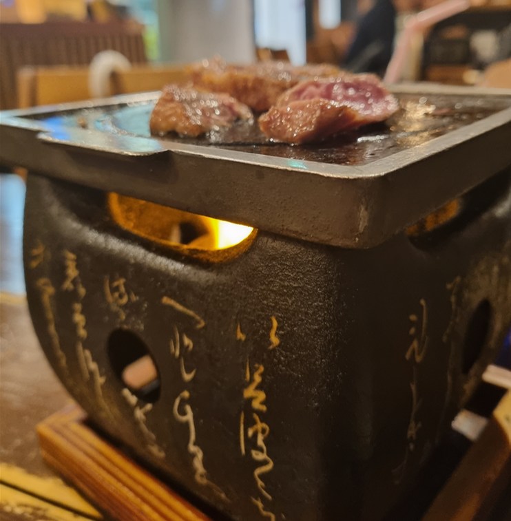 레어상태로 화로에 직접 구워 먹는 규카츠입니다.