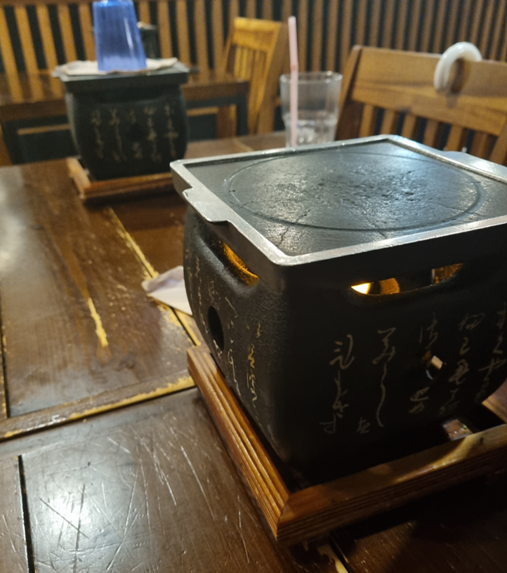 주문 후에 규카츠와 스테기를 구워먹을 수 있도록 화로에 불을 붙여줍니다.