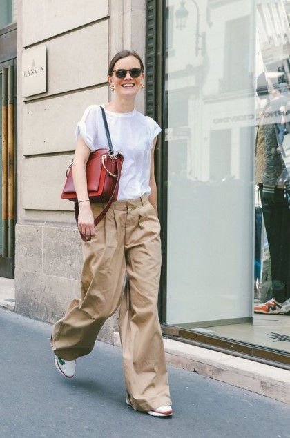두 분다 와이드한 베이지팬츠를 티셔츠와 소화해서 캐주얼하면서도 세련된 스타일의 코디같아요.