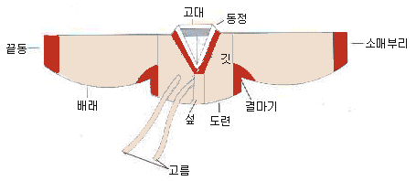 너무 죄지 않게 고름을 맨 다음 고대와 어깨 솔기가 뒤로 넘어가지 않게 숙여지도록