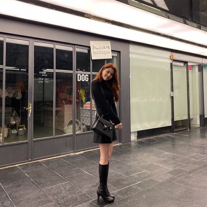 블랙 컬러의 롱부츠가 잘 어울리는 한소희 씨네요.