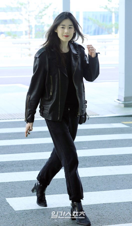 정은채님은 블랙색상의 가죽라이더 자켓에 블랙색상의 팬츠와 코디까지 올블랙으로 코디한 모습입니다.