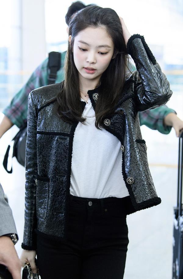 지수님은 와이드한 팬츠에 검정색 가죽라이더 자켓을 매치해 스타일리시함을 보여주었네요.