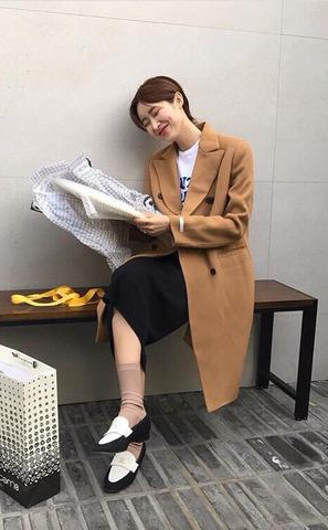 가을 느낌이 물씬 느겨지는 색상의 브라운코디에 로퍼까지 톤을 맞춰 코디한 모습이네요.