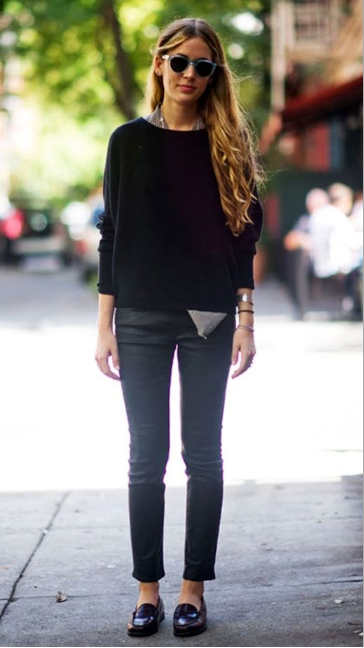 검정색 스키니진에 검정색 로퍼를 매치해주어 깔끔하게 색상을 맞춰 다리가 더 길어보이는 것 같네요.