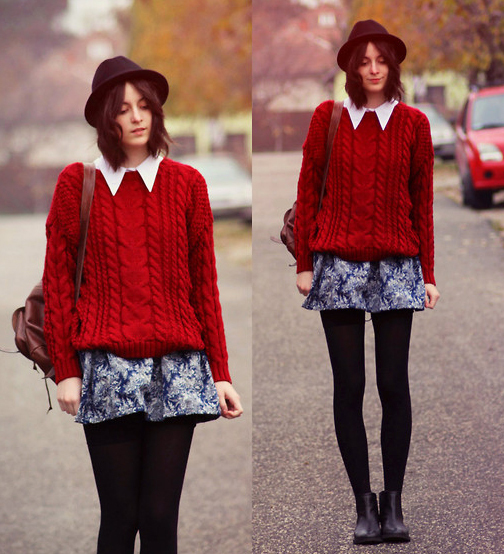 레드색 니트에 H라인 블루색 스커트를 코디해서