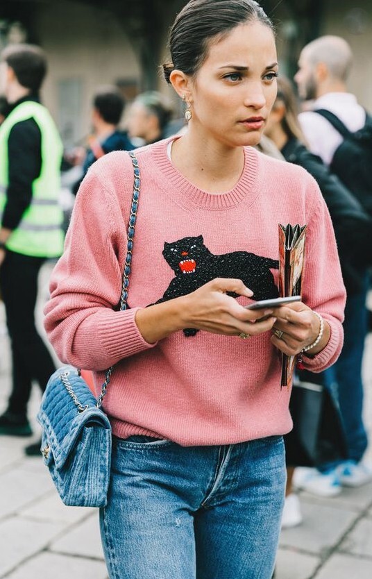 핑크색상의에 청바지와 매치하면 좀 더 캐주얼한 느낌도 나타 낼 수 있으면서도
