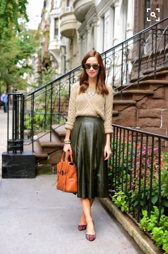 꽈배기 니트에 가죽스커트를 매치한 모습인데