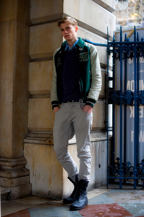 회색색상의 야구점퍼와 생지 데님을 함께 매치해 준 홍종현.