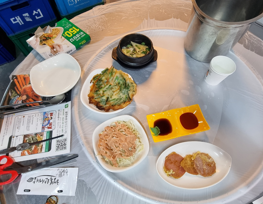 양배추 샐러드, 파전, 어묵탕, 소시지전등이 나와요.