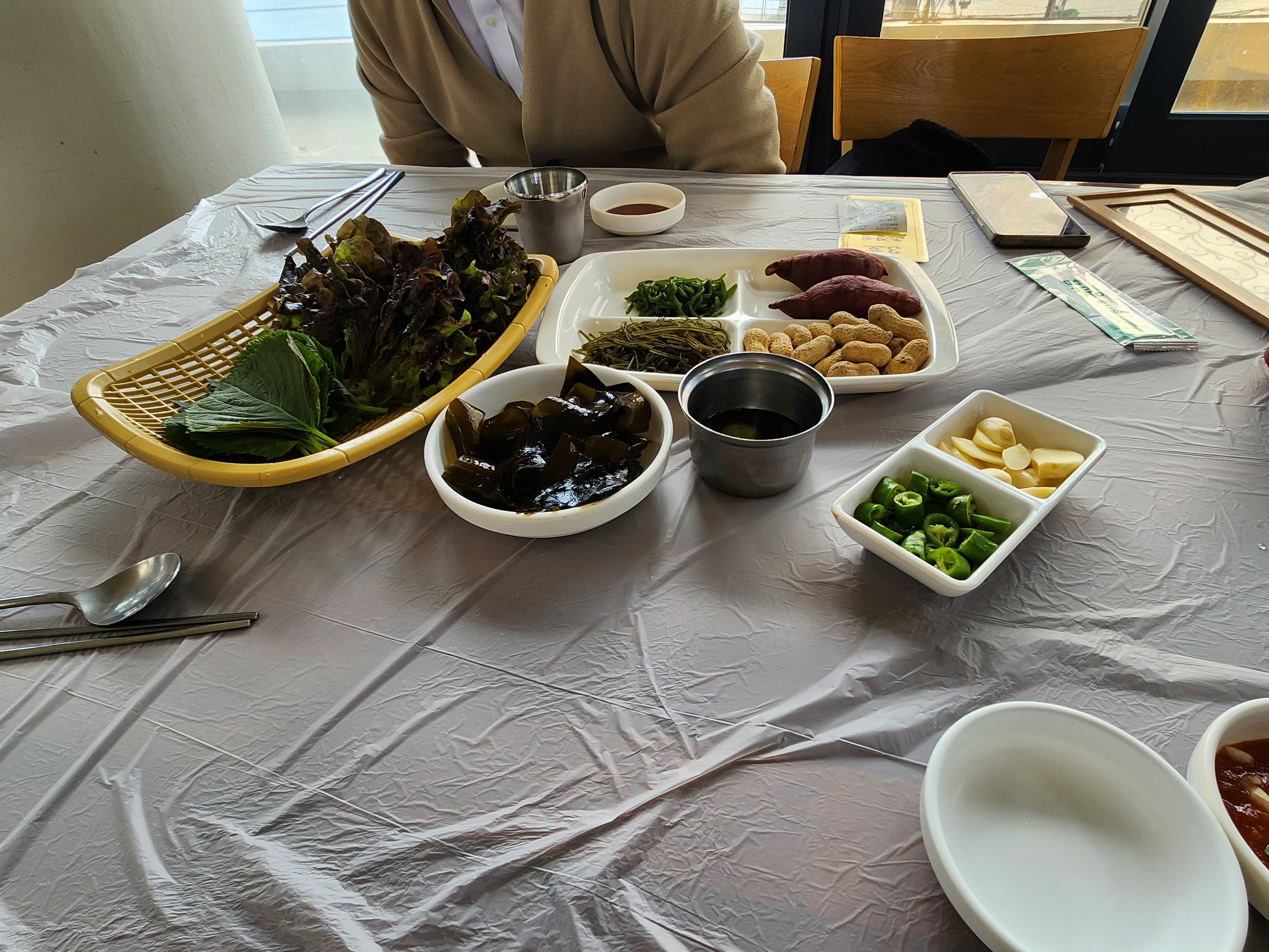 고구마, 땅콩, 미역, 시금치, 쌈채소가 제공됩니다.