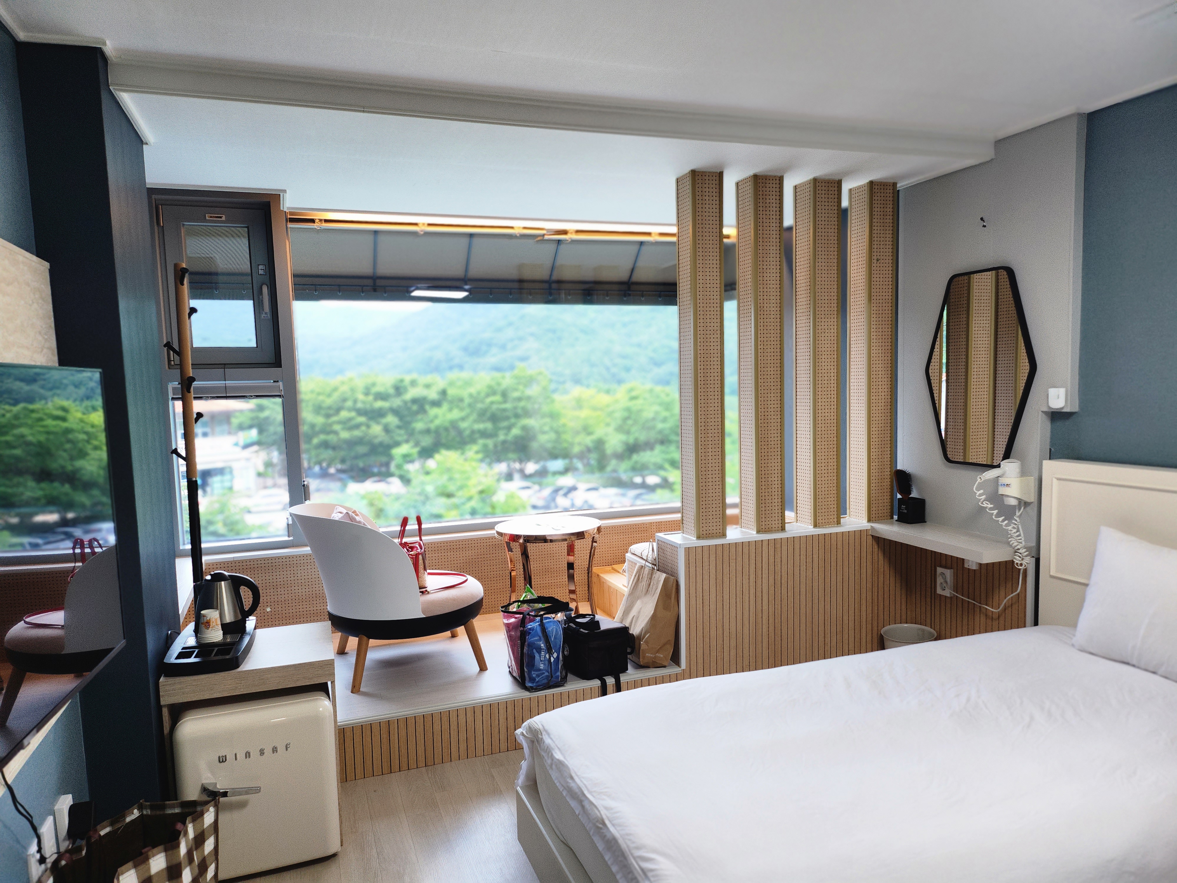 옆 쪽에 작은 냉장고에 생수 2개가 있고 간단한 것들 시원하게 보관하기 좋았습니다.