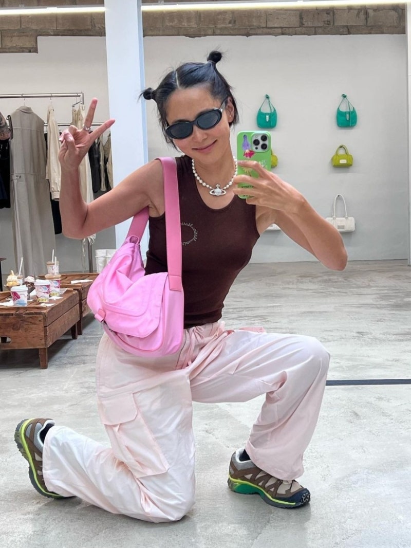 핑크색 카고바지에 핫한 핑크 가방에 볼드한 비비드 웨스트우드 진주목걸이까지
