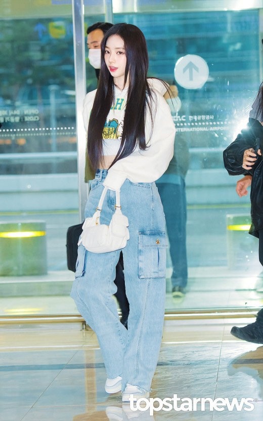 오버핏 카고바지에 크롭기장의 화이트 상의를 매치해서 깔끔하게 코디한 사진이네요.