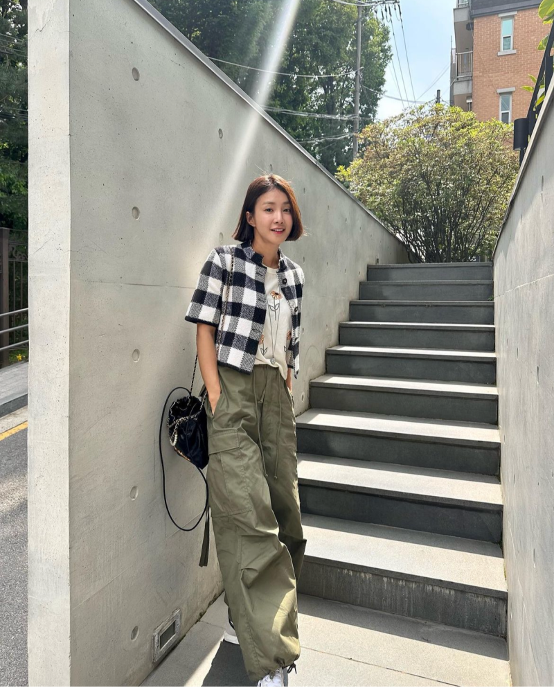 밝은 색의 카고 팬츠라 여름에도 시원하게 입을 수 있겠어요.