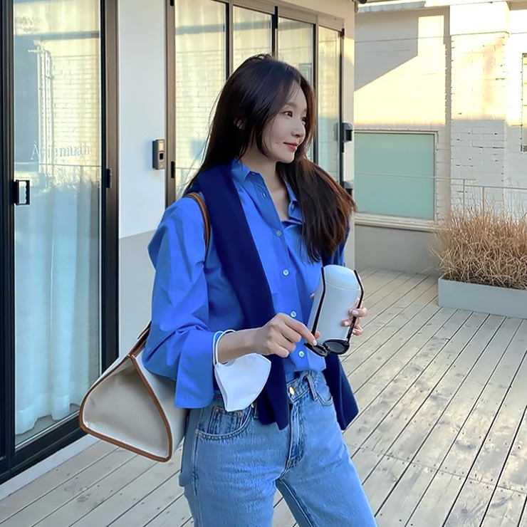 블루셔츠에 청바지 조합인데 주말 데이트룩, 피크닉룩으로 딱이지 않나요.