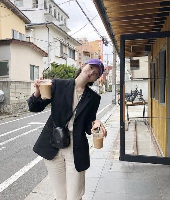 깔끔한 룩의 정석이죠.! 블랙재킷과 위에 탑 이너와 하의를 모두 화이트계열로 맞추어 깔끔하고 무난하게