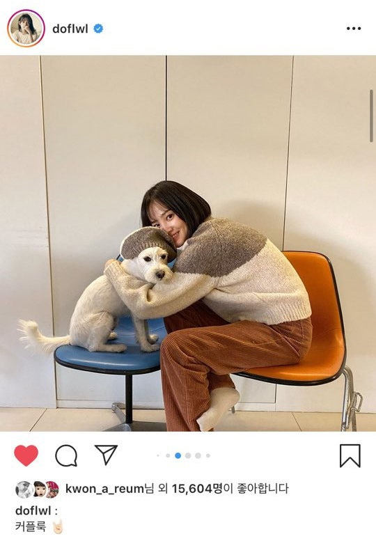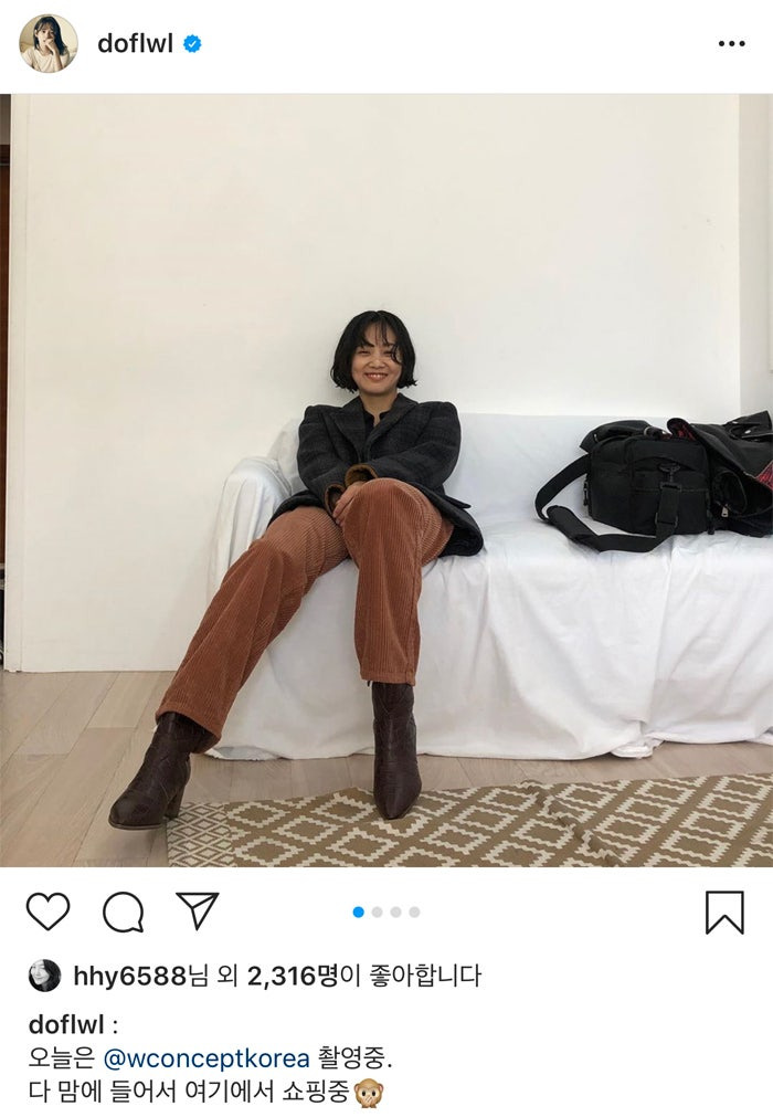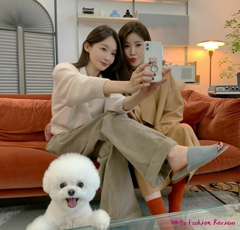 윤승아 씨는 브라운 색감의 코듀로이 팬츠로 따뜻한 분위기의 코디를 보여주네요.