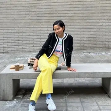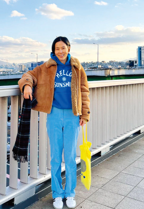 정말 쨍한 색감의 코듀로이 팬츠를 매치한 김나영 씨예요.