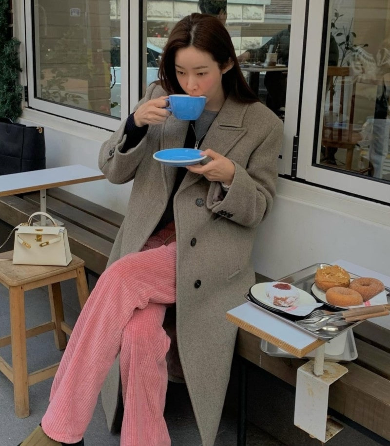 강민경 씨는 와이드 한 코듀로이 팬츠와 바지와 톤을 맞춘 상의까지 베이지러버가 좋아하는 코디입니다.