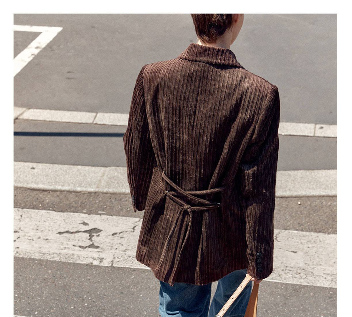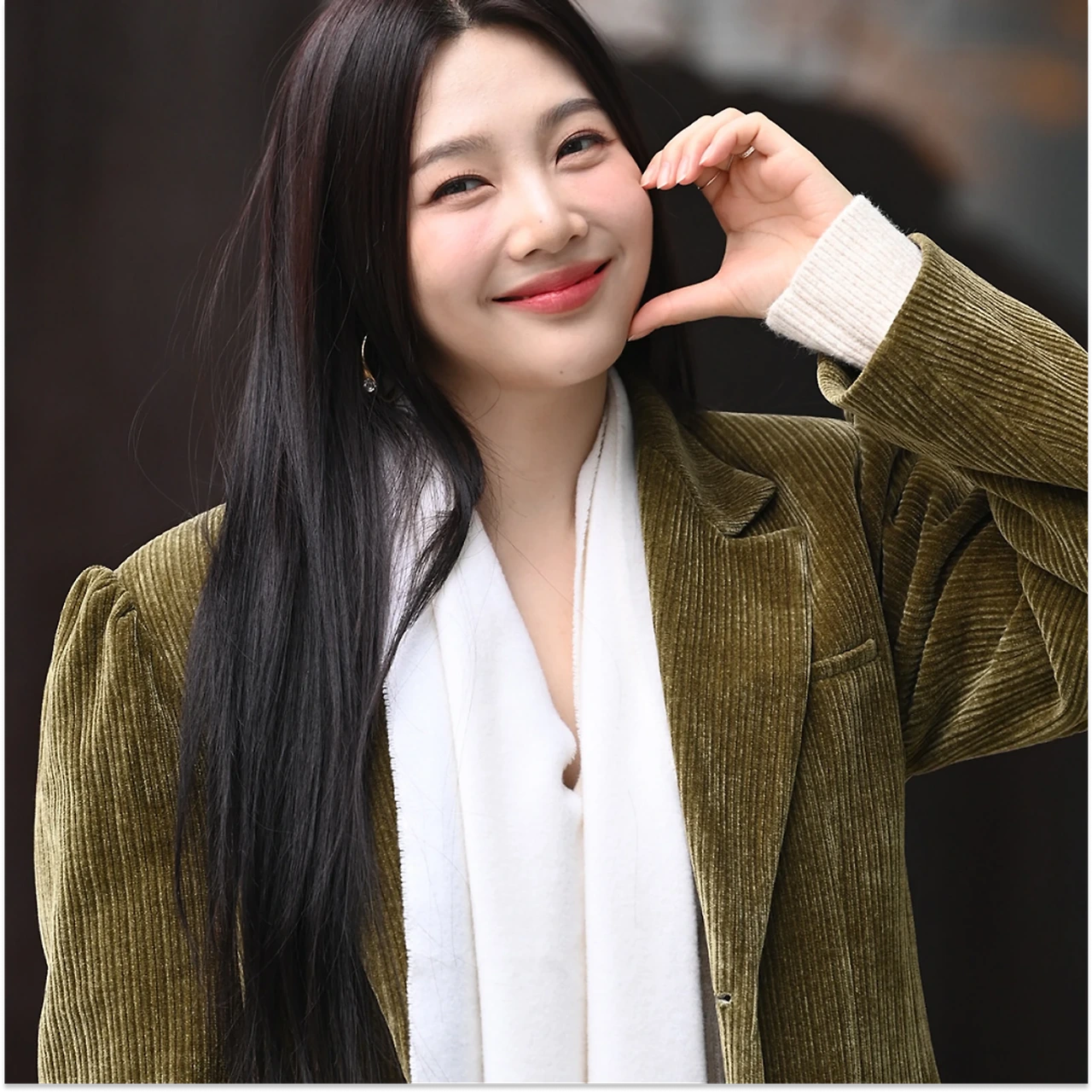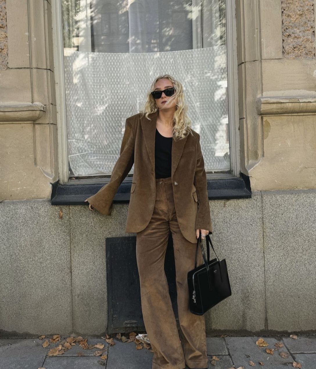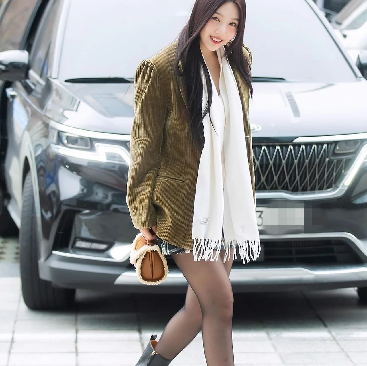 요즘 아파트로 인기 중인 로제는 코듀로이 소재의 팬츠와 자켓으로 셋업처럼 맞춰 입은 모습이에요.