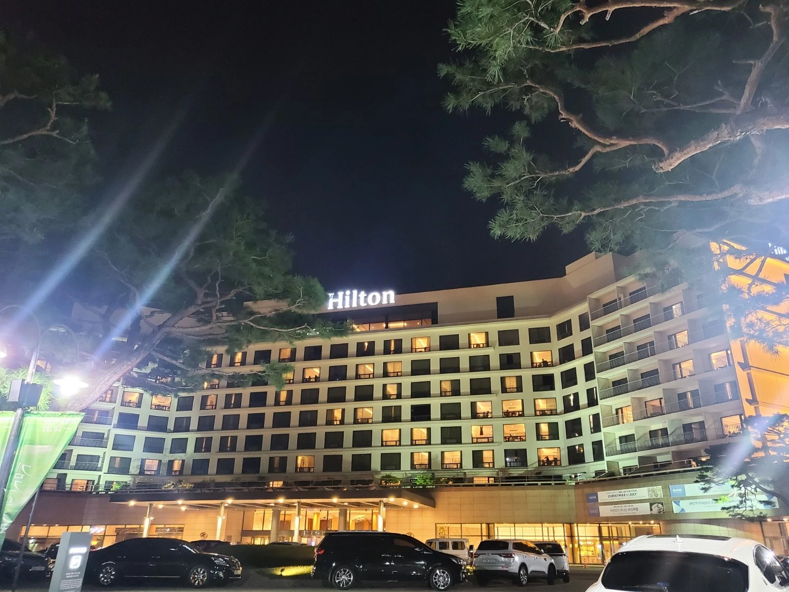 들어오면서 밤에 힐튼 외부를 찍어 보았습니다.