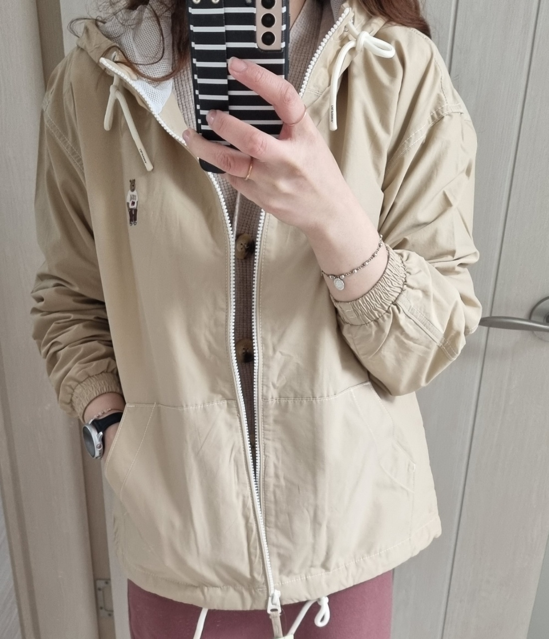 베이지색이라 청바지랑도 잘 어울리고 흰색바지랑도 잘 어울리더라구요.